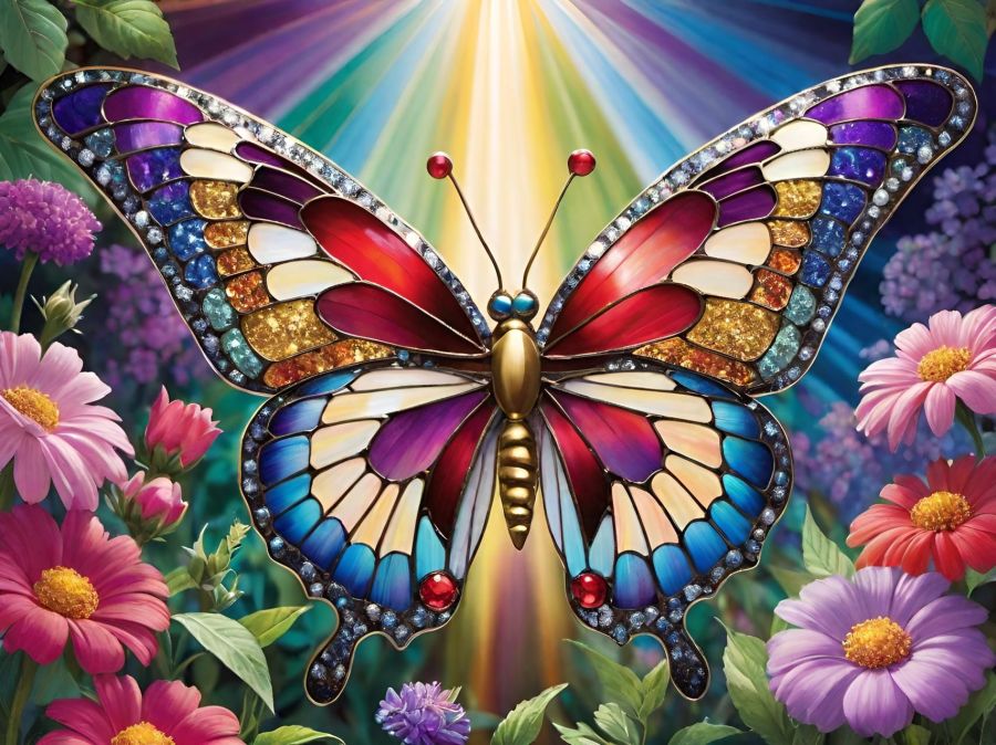 I saved a lot of my prompts before they started having problems near the end of 2024 when all the old prompts were erased. I think this may be a collection of some of the prompts I used: ”detailed butterfly with stained glass wings, in a garden of pastel flowers, colorful rays of light in the background, red, blue, purple, green, glittery, gold, silver, sparkles, colorful, sparkling, jeweled, jewel tones, bright, hot pink, glowing, garden, glitter, beautifully lit” The next image is what I get now with these prompts and using the Dreamland V3 filter. You can see the details are better, so if they ever get everything fixed again, it will certainly be a wonderful app for playing with color and making butterfly memories.