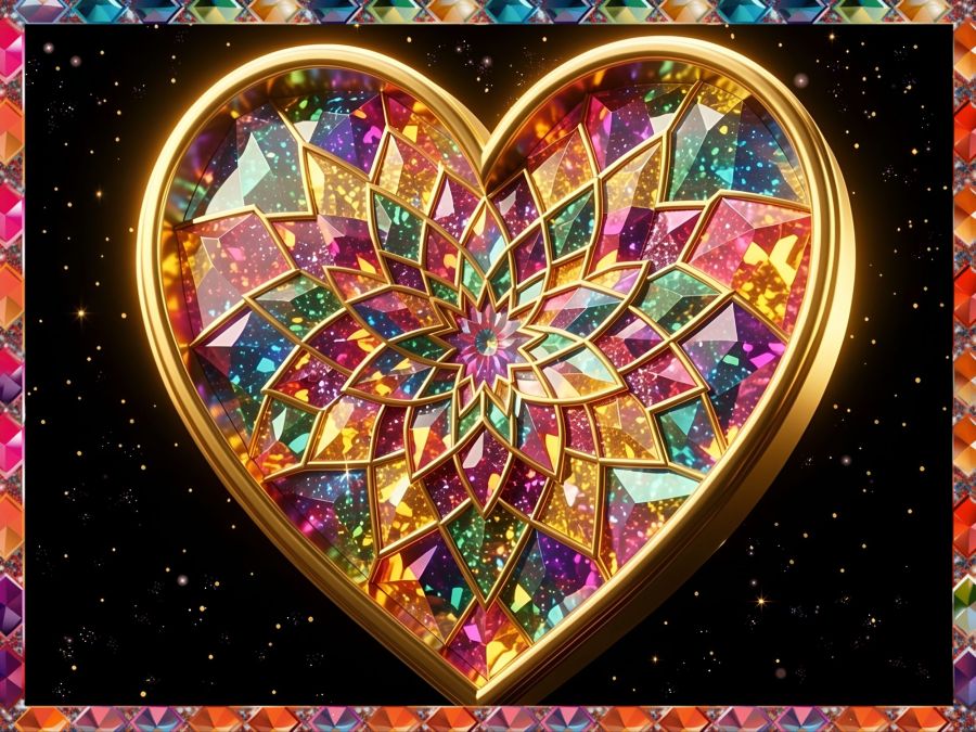 3D Heart-shaped kaleidoscope mandala with a 3d gilded edge and filled with colorful glittery prisms, on a black background with some super tiny golden sparkle in the black, HDR, pro photo, brilliantly lit, glowing, amazing atmosphere