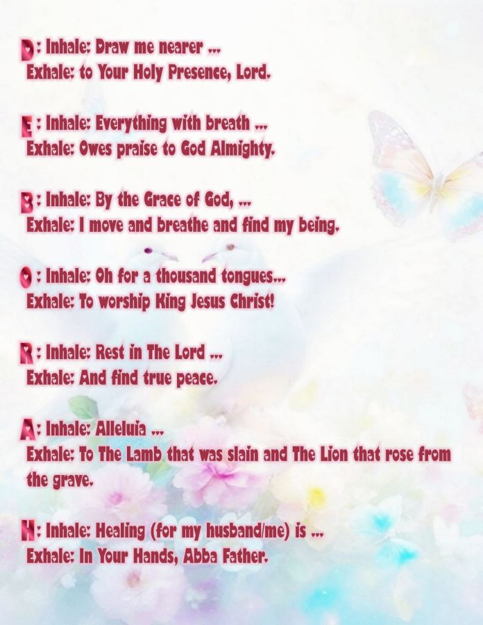 So, I wanted a good way to remember some breath prayers for myself, and after trying different memory tricks, I decided to use the letters in my own first name as an acronym. I liked creating them so much that I wrote a bunch of prayers for others as well and now call them Breath Prayer Acronyms. And then I started putting them on pretty backgrounds to send to others who might need “inspiration.” For example, for the friend with cancer I’ve asked readers to pray for and his caregiving wife. The images I made for them are at the bottom after the video. There’s also an image I made using the letters for our writer’s group.