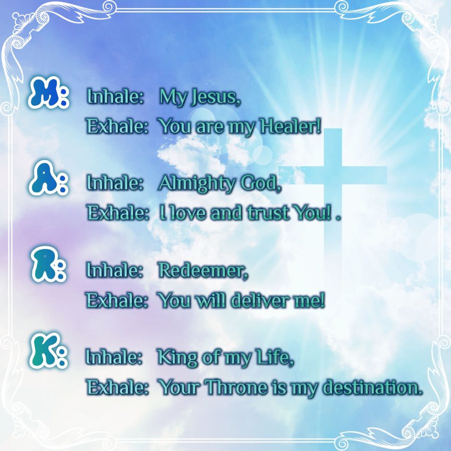 But first, here are the prayers for my own name without using an image background. And if you comment that you’d like me to write a breath prayer acronym for your name, I’ll gladly try. If I don’t know you, I’m not certain how it will come out since personalities and needs have ended up in all the acronyms I’ve written so far, but God could inspire me to write exactly what works for you without knowing anything about you. He does that sometimes. 🙂 Anyway, here’s mine…